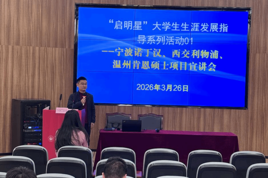 当前正值考研复试与春季招聘的关键期,部分学子在升学与就业的十字路口面临抉择。为切实提升大学生的职业生涯规划意识与研判能力,帮助学生打破信息壁垒、拓宽深造视野,本次讲座重点聚焦“中外合作办学硕士”这一国际化升学路径。活动邀请宁波诺丁汉大学、西交利物浦大学、温州肯恩大学三所高校的招生负责老师亲临现场,从项目培养理念、国际化视野拓展、综合能力塑造及就业核心竞争力等维度展开深度解读,旨在引导学生结合个人禀赋与职业愿景,探索更为多元的深造与发展方案。