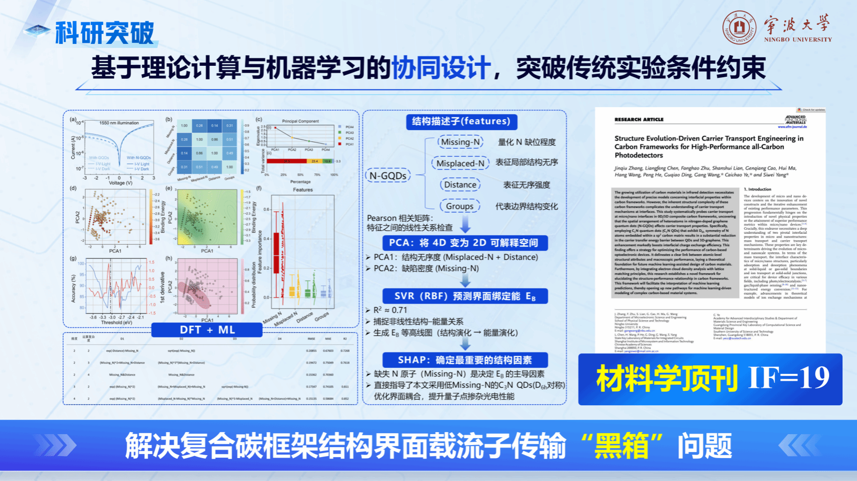 在科研方面,张金秋以第一作者发表SCI论文4篇,参与发表论文11篇,总影响因子超过120;申请发明专利16项,授权6项。基于理论计算与机器学习的协同设计,他突破了传统实验条件约束,解决了复合碳框架界面载流子传输的“黑箱”问题,相关成果发表在材料学顶级期刊《先进功能材料》上。